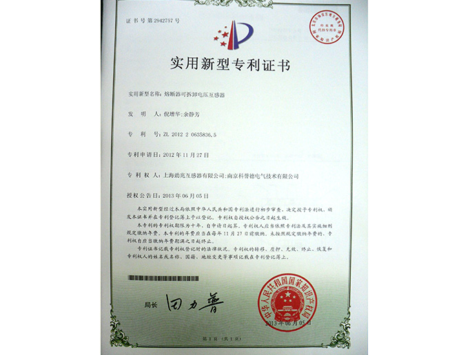 熔絲分離式互感器專利證書